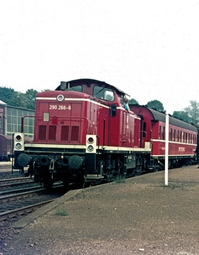 Bild unten: Die 290 999-2 ist eine von der Bundeswehr ausgeliehene Lok im Dienst der Bundesbahn. Copyright: Peter Schiffer / Slg. Eisenbahnstiftung